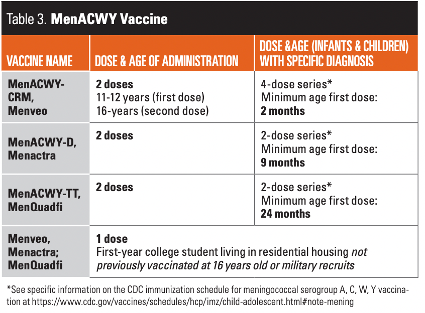 In addition, the vaccine is available for children with specific medical conditions like anatomic or functional asplenia, sickle cell disease, HIV infection, and persistent complement component deficiency and for those receiving complement inhibitors (eg, eculizumab, ravulizumab).15 Three MenACWY vaccines are available in the US. The MenACWY is administered to infants, toddlers, and young children with one of the conditions listed above based on the particular FDA approval.15 For example, these children can receive the first dose of Menveo (MenACWY-CRM) at 2 months; or Menactra (MenACWY-D) at 9 months or MenQuadfi (MenACWY-TT) at 24 months (Table 3).15 Infants and children with these medical conditions are often cared for in specialty centers. To prevent errors in, all providers should consult the CDC immunization schedule for children with medically complex conditions.15