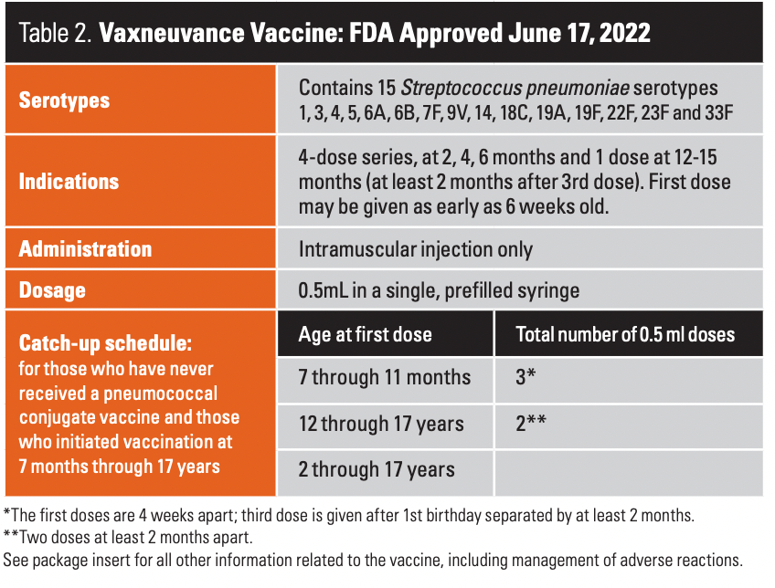 On June 22, 2022, the FDA approved the pneumococcal 15-valent conjugate vaccine for pediatric use.16If initiated with a lower valency (eg, PCV-13), this 4-dose series can be completed with Vaxneuvance (PCV-15).16 Only 1 dose of Vaxneuvance (PCV-15) is required per the catch-up vaccine schedule for children 2 through 17 years who have not received any other doses of PCV-13 (Table 2).